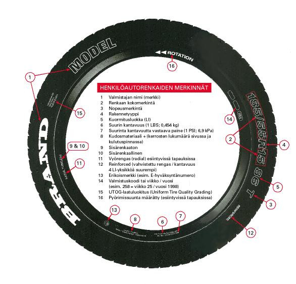 Renkaan kokomerkintä on yleensä esim. 195/70 R 14 84 T ja tarkoittaa seuraavaa: